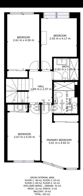 1º planta: amplio hall, 4 dormitorios grandes con armarios empotrados, Amplios ventanales, de origen son cuatro dormitorios dobles, dos baños (el dormitorio Principal con armario empotrado, y amplio baño).